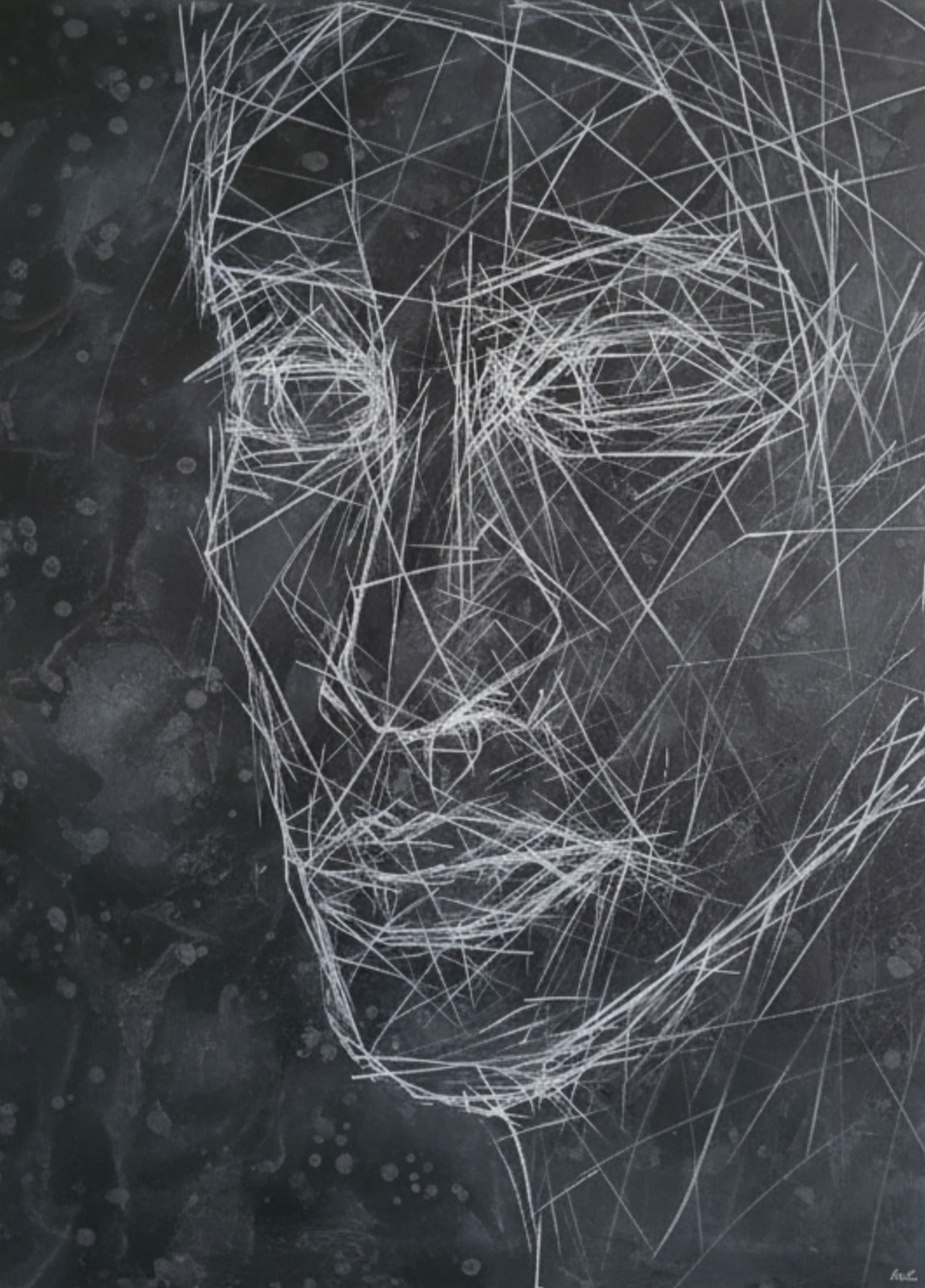 The canvas is dominated by a dark, textured background that adds depth and atmosphere. Over this, a face emerges—constructed entirely of sharp, angular, white chalk marker lines. The intersecting strokes resemble shattered glass or a web of light beams, giving the portrait a fragmented, almost holographic presence.